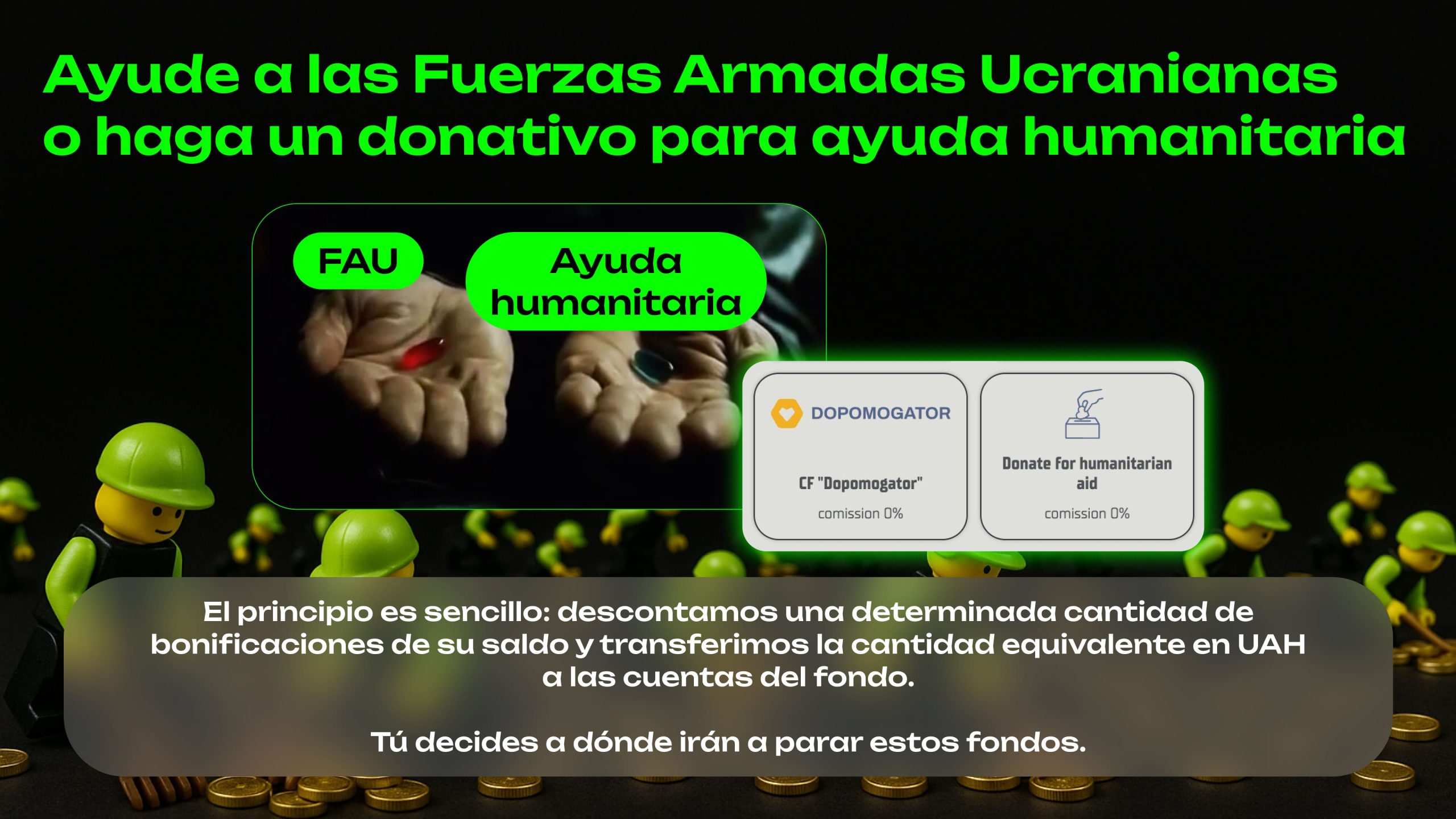 El principio es simple: deducimos una cierta cantidad de bonificaciones de tu saldo y transferimos el monto equivalente en grivnas a las cuentas del fondo. ¡A dónde irán exactamente estos fondos depende totalmente de ti! Puedes dirigirlos para ayudar a las Fuerzas Armadas de Ucrania o para necesidades humanitarias.