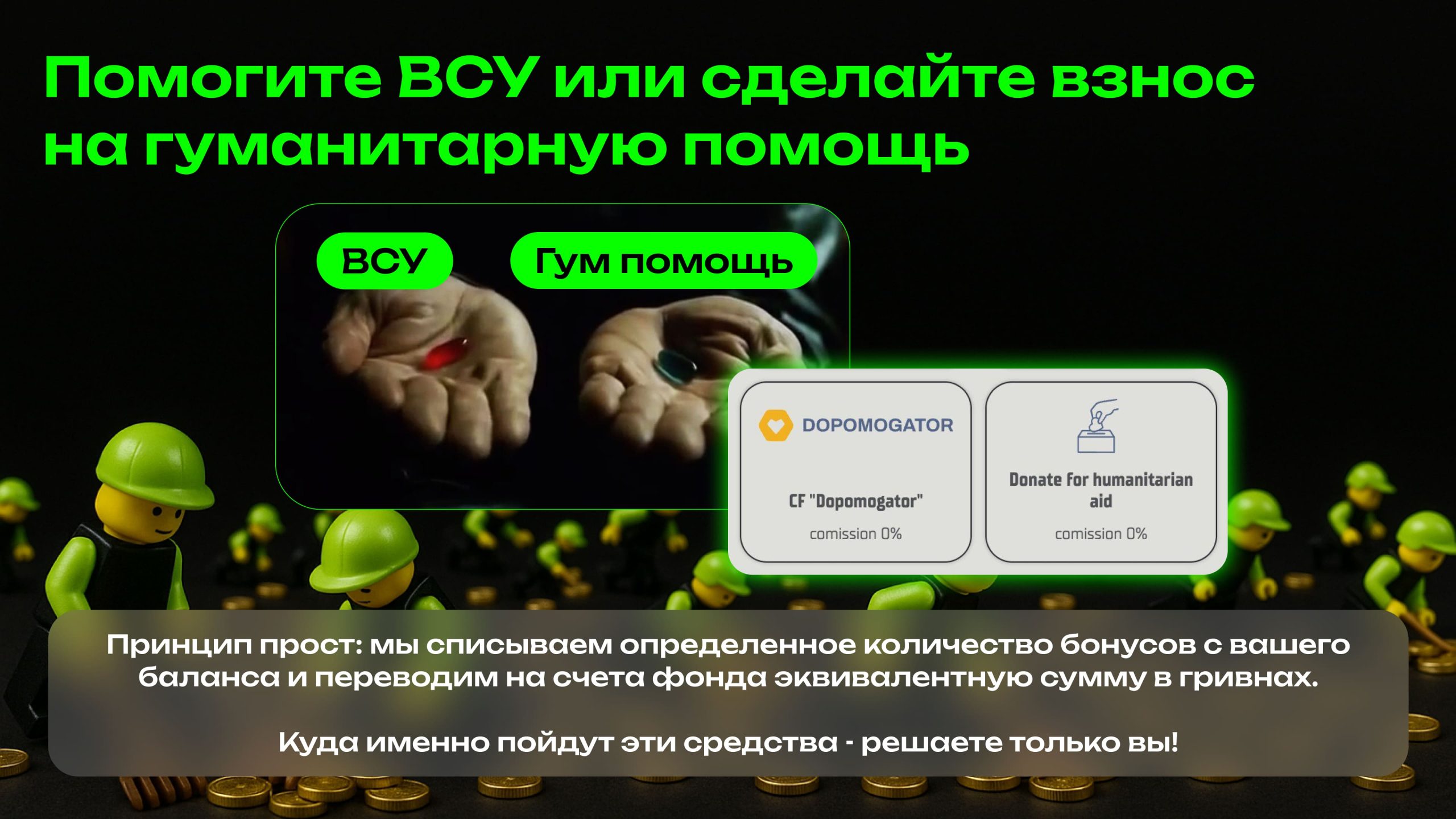 Бонусы – это не только способ сэкономить или получить что-то для себя. Вы можете использовать их с пользой для общества, пожертвовав в фонд Dopomagator.