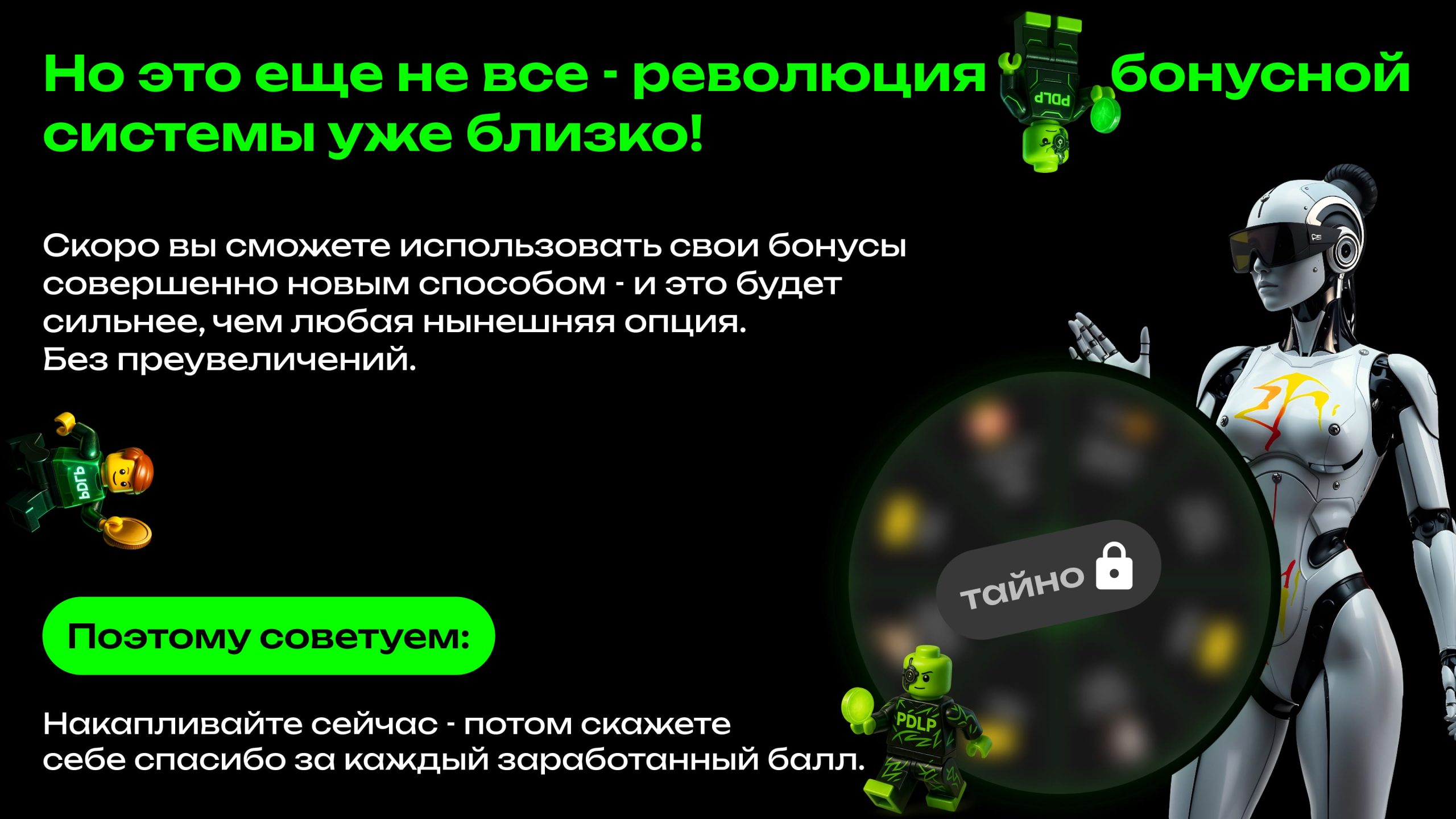 Поэтому самое главное сейчас — накапливать максимальное количество бонусов. Чем больший баланс бонусов у вас будет к запуску новой системы, тем больше выгоды вы получите от революционной механики, которую мы готовим. Поэтому бегите зарабатывать уже сейчас!