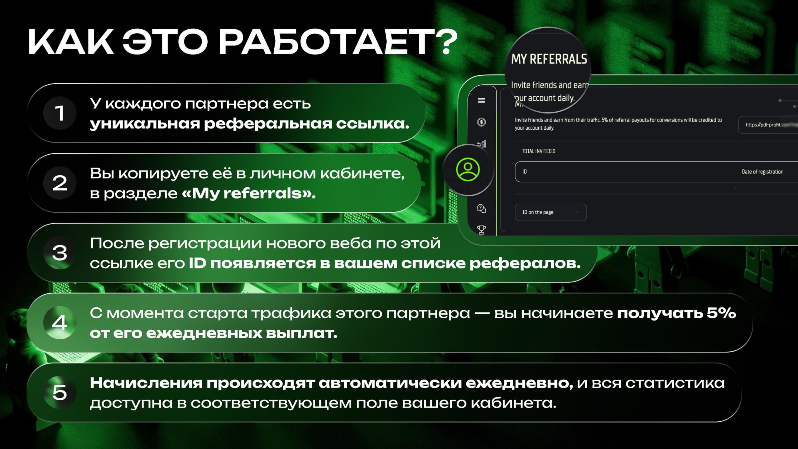 - С момента старта трафика этого партнера — вы начинаете получать 5% от его ежедневных выплат.
