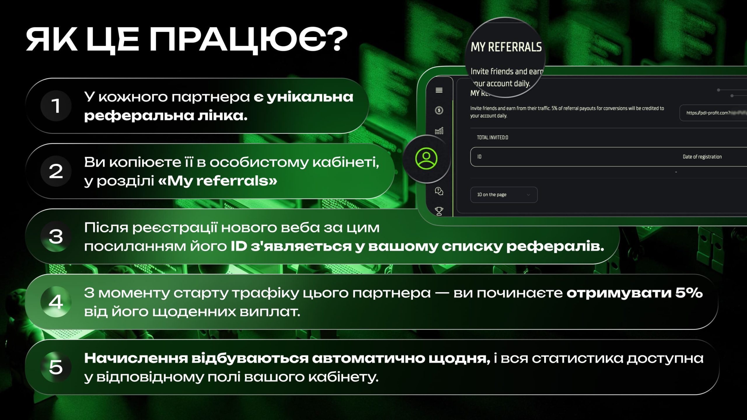 - З моменту старту трафіку цього партнера — ви починаєте отримувати 5% від його щоденних виплат.