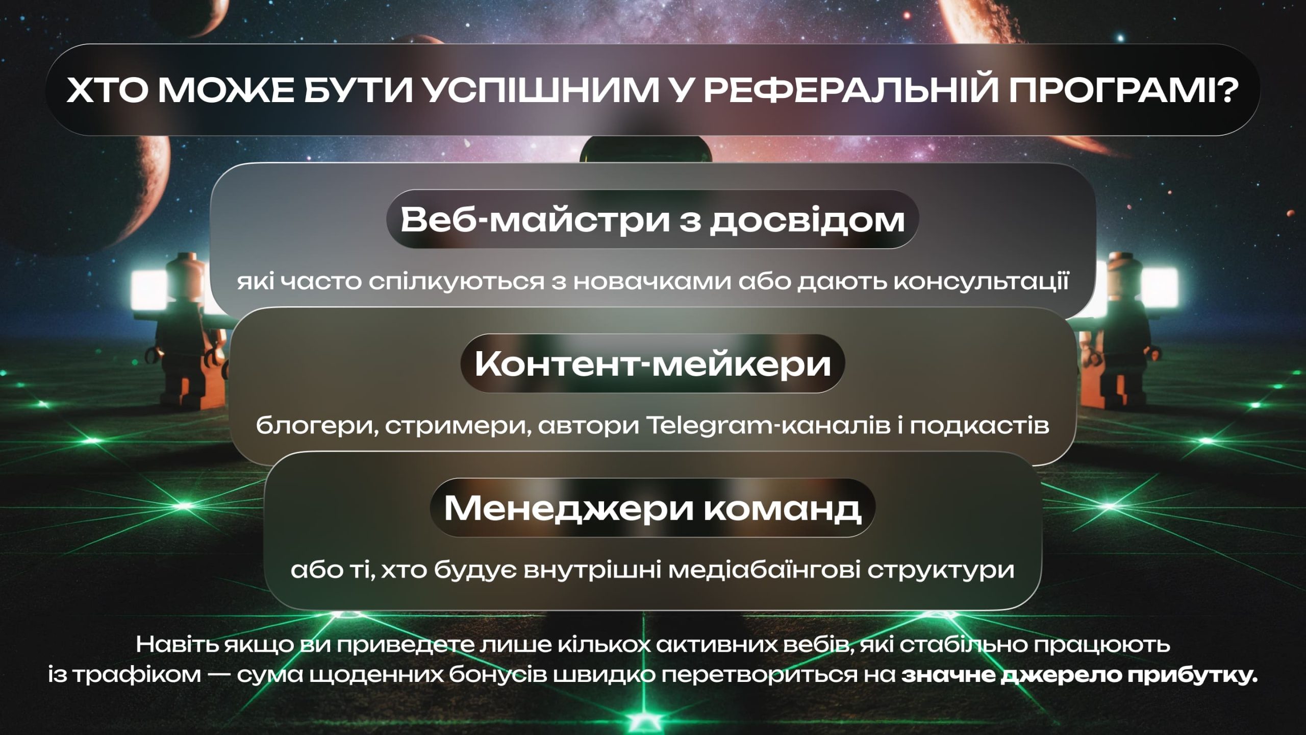 Навіть якщо ви приведете лише кількох активних вебів, які стабільно працюють із трафіком — сума щоденних бонусів швидко перетвориться на значне джерело прибутку.